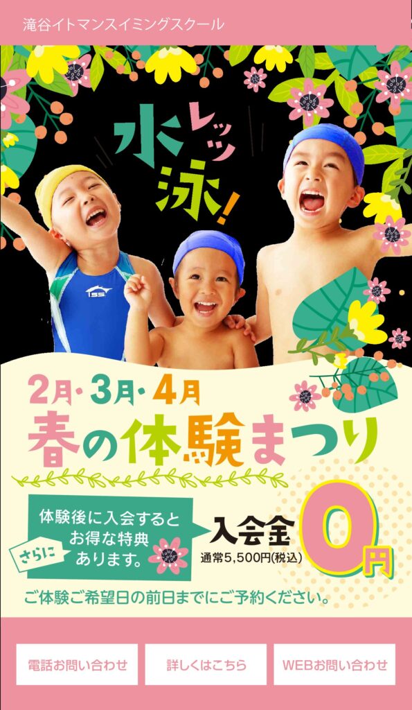 全く泳げない方でも一からご指導させて頂きます。個々のレベルに合わせたクラスで無理なく泳ぐことが出来ますので安心してご参加ください。定評のあるイトマンスイミングスクールのコーチ陣がレベルアップをお約束致します。